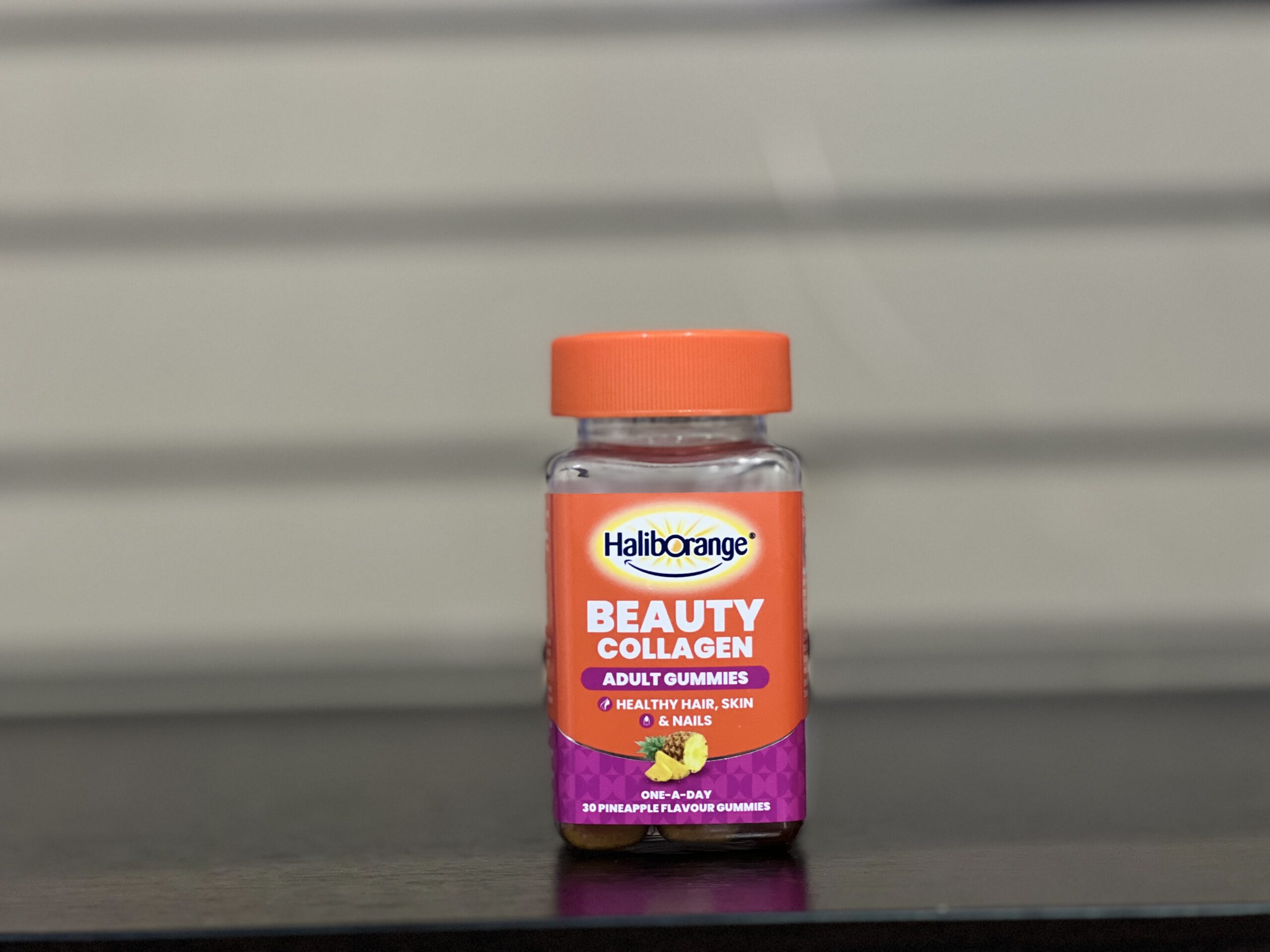 Typically jars or packs of gummy bites (30 gummies) in retail packaging. Example: “Adult Beauty Collagen Gummies – 30 Pineapple Gummies”.