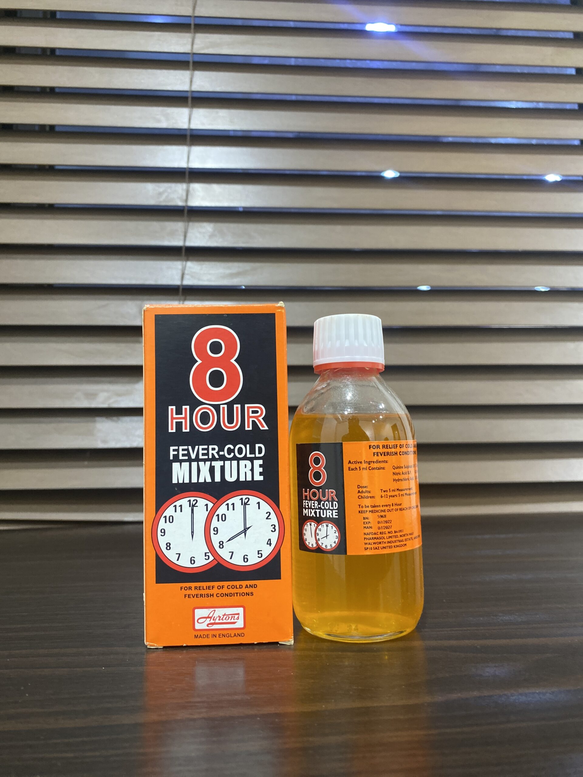 8-Hours Fever Cold Mixture is an over-the-counter medication used to relieve symptoms of cold and flu, such as fever, headache, and body aches. Yellow Liquid in 200ml bottle.