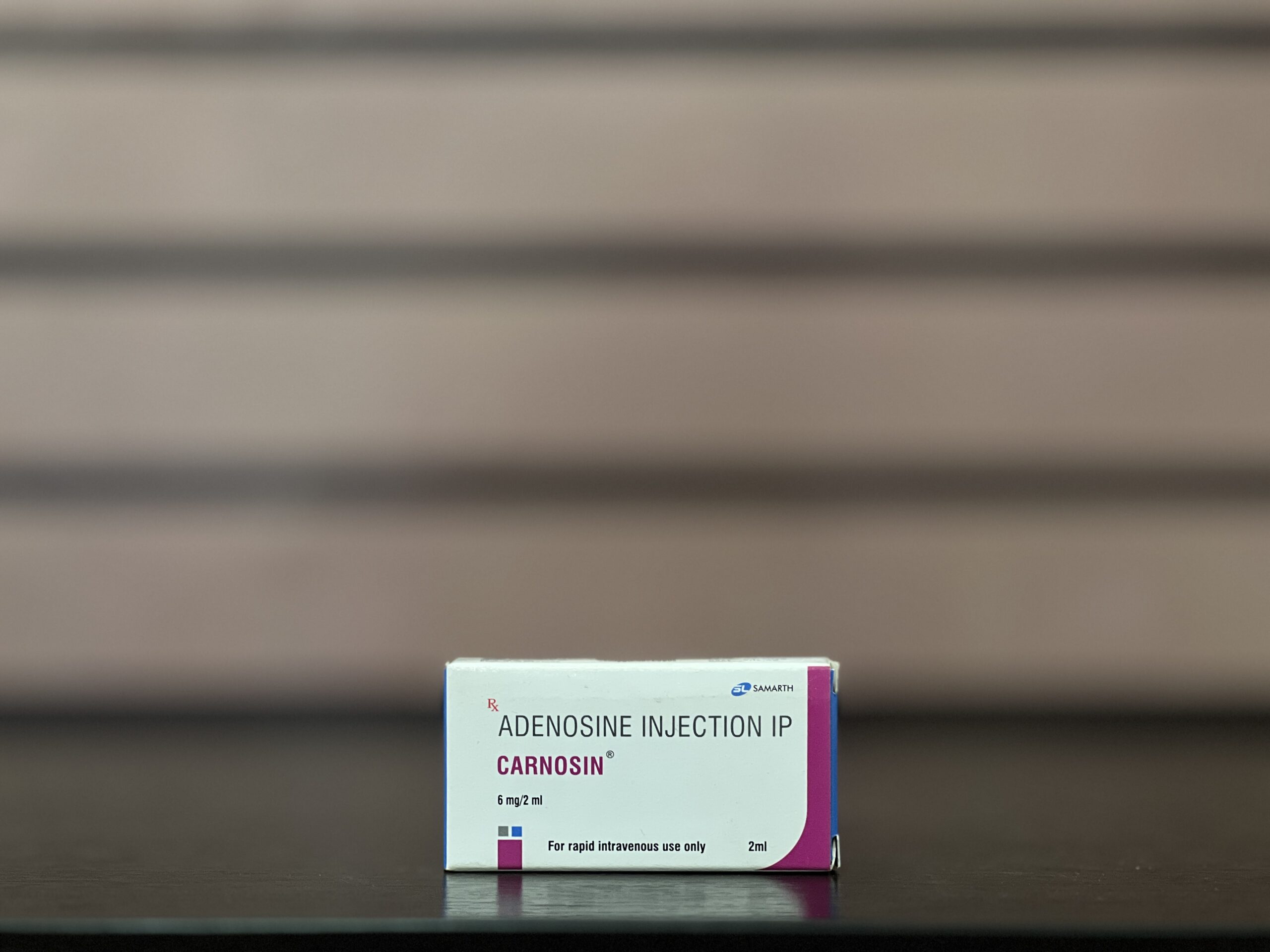 Adenosine Injection IP Carnosin 6mg/2ml by SAMARYTH (Samarth Life Sciences) is a sterile, fast-acting antiarrhythmic medication used primarily for the emergency conversion of paroxysmal supraventricular tachycardia (PSVT) to sinus rhythm. It works by slowing conduction through the AV node and interrupting re-entrant circuits in the heart. It is also used as a diagnostic aid during cardiac stress testing or myocardial perfusion imaging.