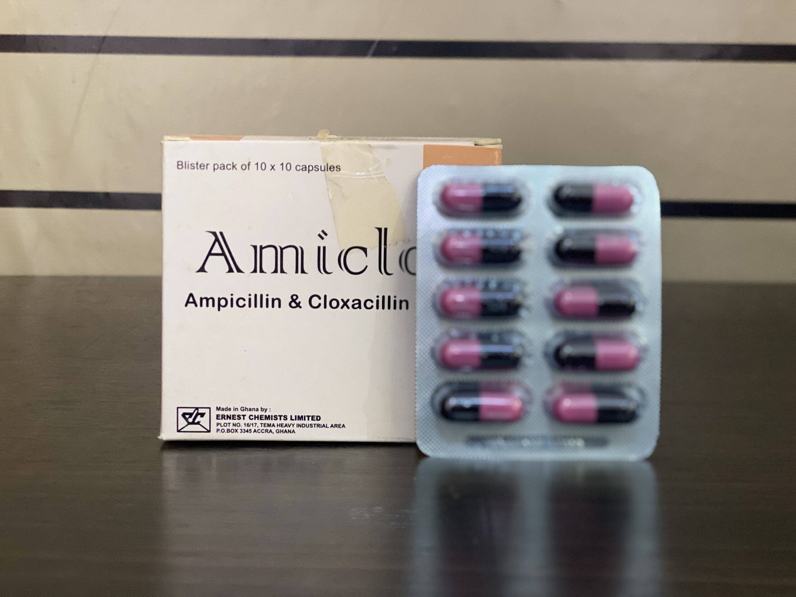 Amciclox Capsules (often listed as Amiclox [ECL] Capsules by Ernest Chemists Limited in Ghana) is a combination antibiotic containing ampicillin (a broad-spectrum penicillin) and cloxacillin (a penicillinase-resistant penicillin). It treats bacterial infections caused by susceptible organisms, including mixed staphylococcal and streptococcal infections where beta-lactamase resistance may be present. Common indications include respiratory tract infections (e.g., tonsillitis, sinusitis, bronchitis, pneumonia), skin and soft tissue infections, ear infections (otitis media), urinary tract infections, bone infections, and post-operative wound infections. It is a widely available, affordable prescription antibiotic in Ghanaian pharmacies (e.g., Scab Pharmacy, Country Medical Pharmacy, Beybee Pharmacy) for bacterial infections requiring oral penicillin therapy.