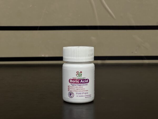 Vaginal boric acid suppositories consist of capsules or suppository forms of boric acid inserted into the vagina, used to help restore vaginal acidity (pH balance) and treat or manage conditions such as recurrent yeast infections (vulvovaginal candidiasis) or vaginal odor/imbalance.