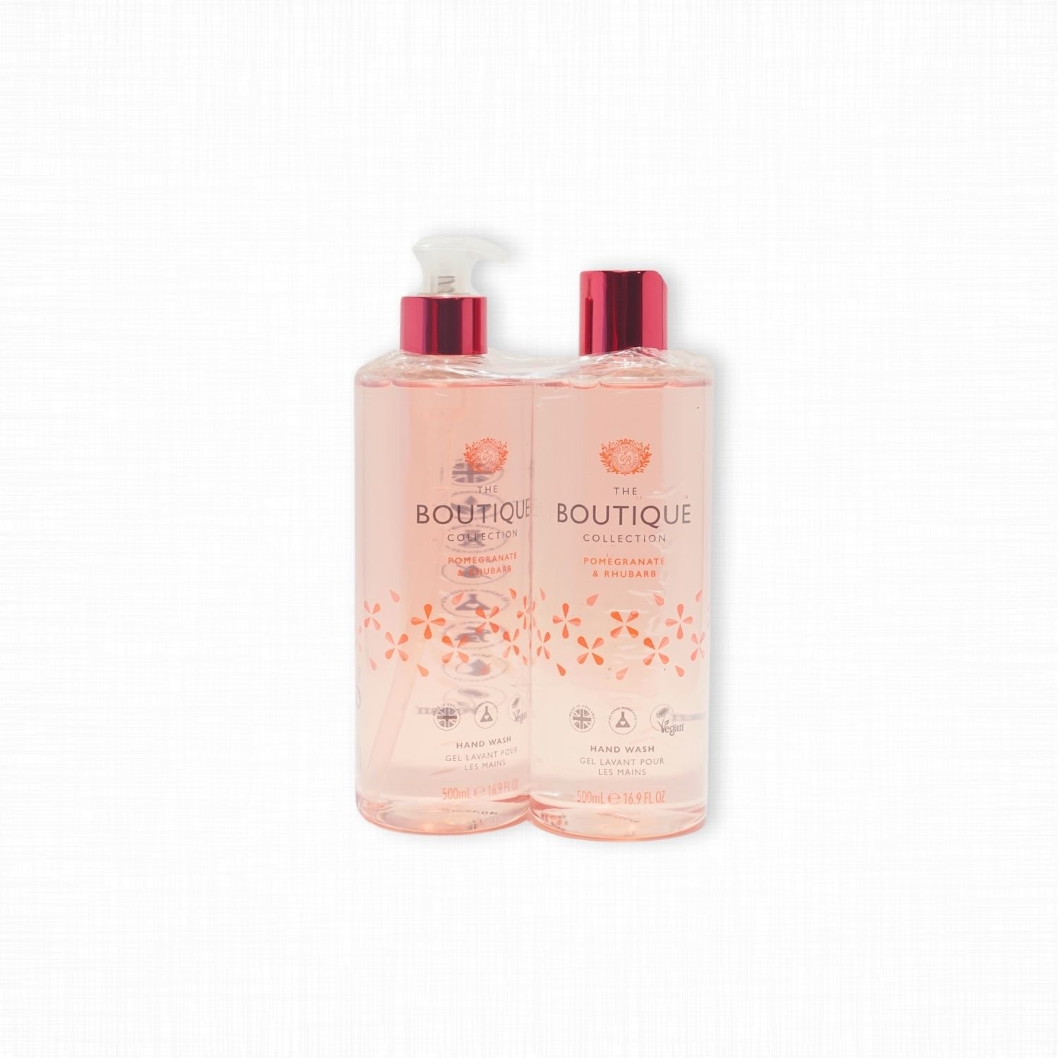 The Boutique Handwash Pomegranate is a 2-pack of 500ml Boutique Pomegranate & Rhubarb Hand Wash. It is a vegan, cruelty-free hand wash made with nourishing aloe vera and vitamin E, featuring a refreshing pomegranate and rhubarb scent.