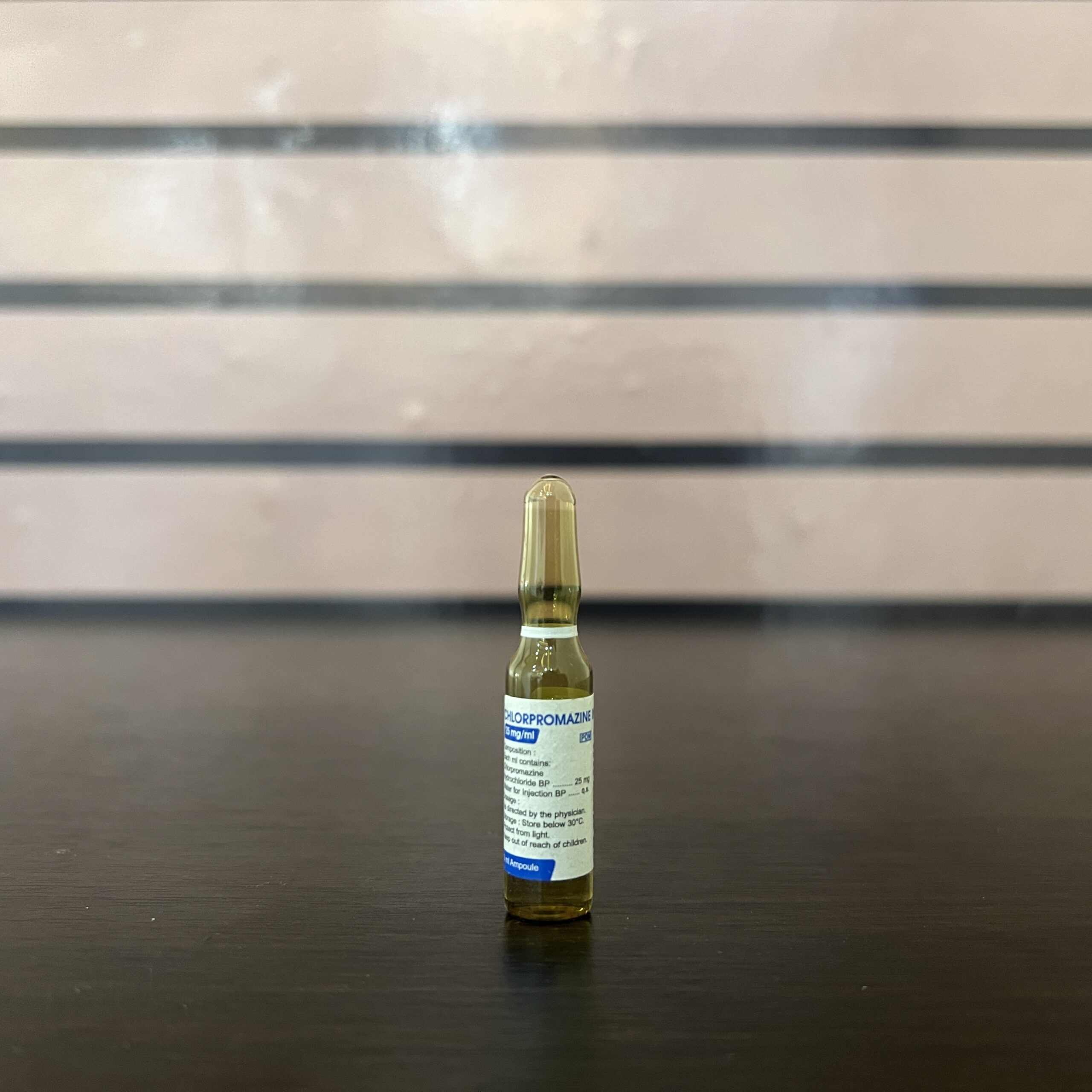 Chlorpromazine 25mg/ml Injection is a typical (first-generation) antipsychotic medication used to treat severe psychiatric disorders such as schizophrenia, mania in bipolar disorder, acute psychosis, severe agitation, and intractable hiccups. It is also used as an antiemetic (to control severe nausea and vomiting) and for preoperative sedation. It works by blocking dopamine receptors in the brain and has additional anticholinergic, antihistaminic, and alpha-adrenergic blocking effects.