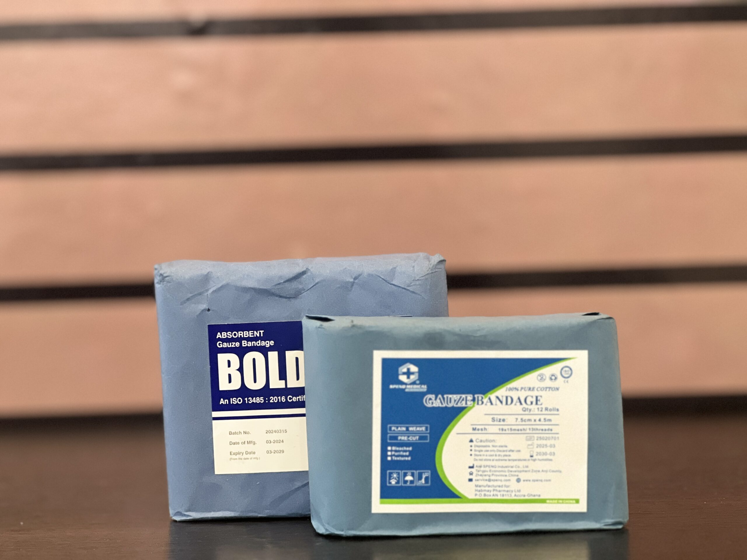 Sterile gauze bandage roll for wound dressing and securing dressings, 3 inches wide. Woven cotton material with hemmed edges. Hypoallergenic.