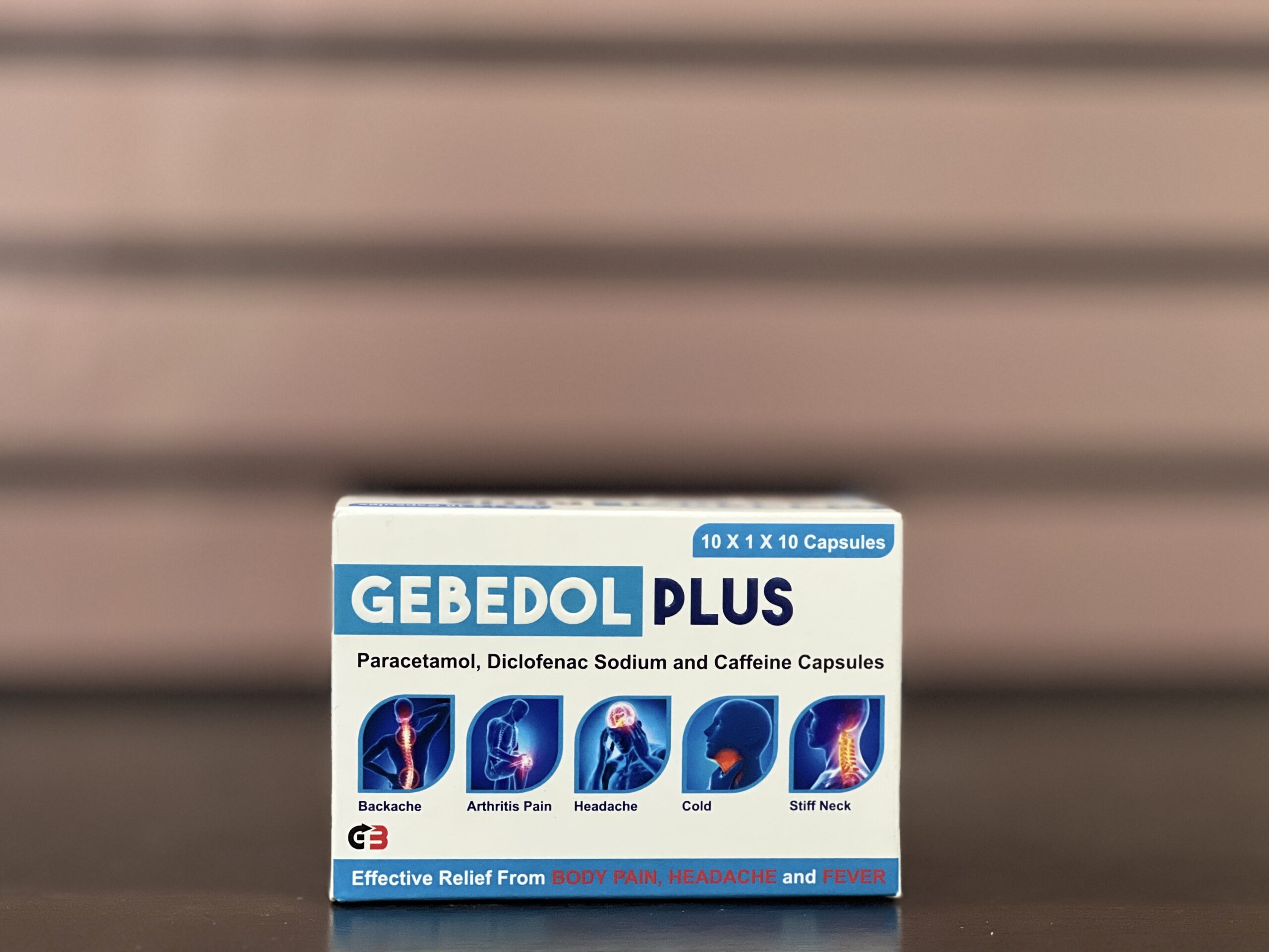 Gebedol Plus Capsules is a combination analgesic medication containing paracetamol, diclofenac sodium, and caffeine. It is used for the relief of moderate to severe pain, inflammation, and associated symptoms such as headache, toothache, menstrual pain (dysmenorrhea), muscle/joint pain, backache, fever, and general body pain. The addition of caffeine enhances the analgesic effect of paracetamol and diclofenac and helps counteract fatigue or drowsiness. In Ghana (Accra), it is a very common, affordable over-the-counter/prescription pain reliever sold in pharmacies for short-term symptomatic relief.