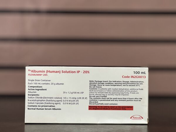 Human Albumin Solution IP 20% (Flexbumin 100ml by Takeda) is a sterile, non-pyrogenic, 20% human albumin solution prepared from pooled human plasma. It is used as a plasma volume expander and colloid to restore and maintain circulating blood volume in cases of hypovolemia (low blood volume) due to burns, trauma, shock, surgery, or acute blood loss. It is also indicated for hypoalbuminemia (low serum albumin) in conditions such as liver cirrhosis, nephrotic syndrome, and critical care settings, as well as for therapeutic plasmapheresis and cardiopulmonary bypass priming. The 20% concentration provides higher oncotic pressure than 5% albumin, allowing effective volume expansion with smaller volumes. In Ghana (Accra), it is a prescription IV product used in hospitals, ICUs, and emergency departments for fluid resuscitation and albumin replacement.