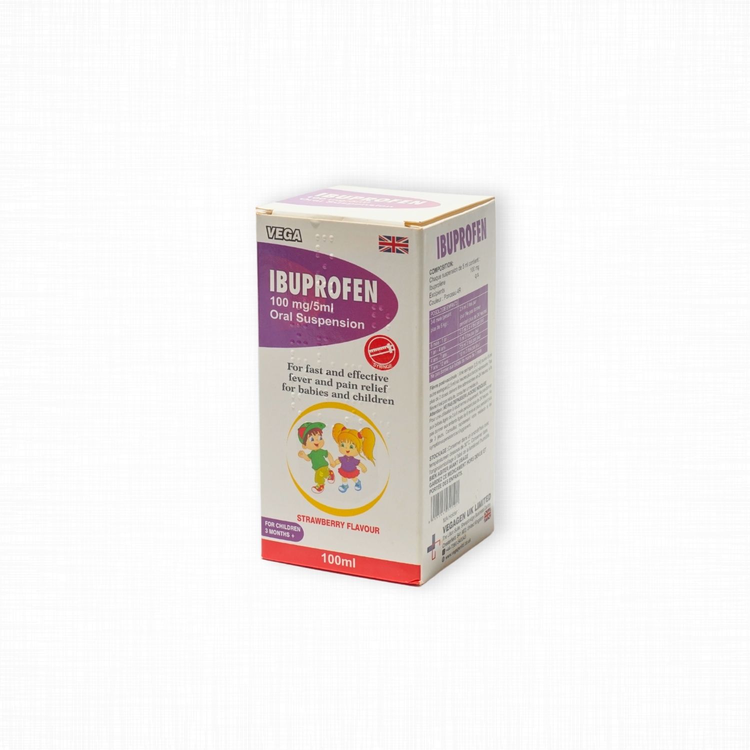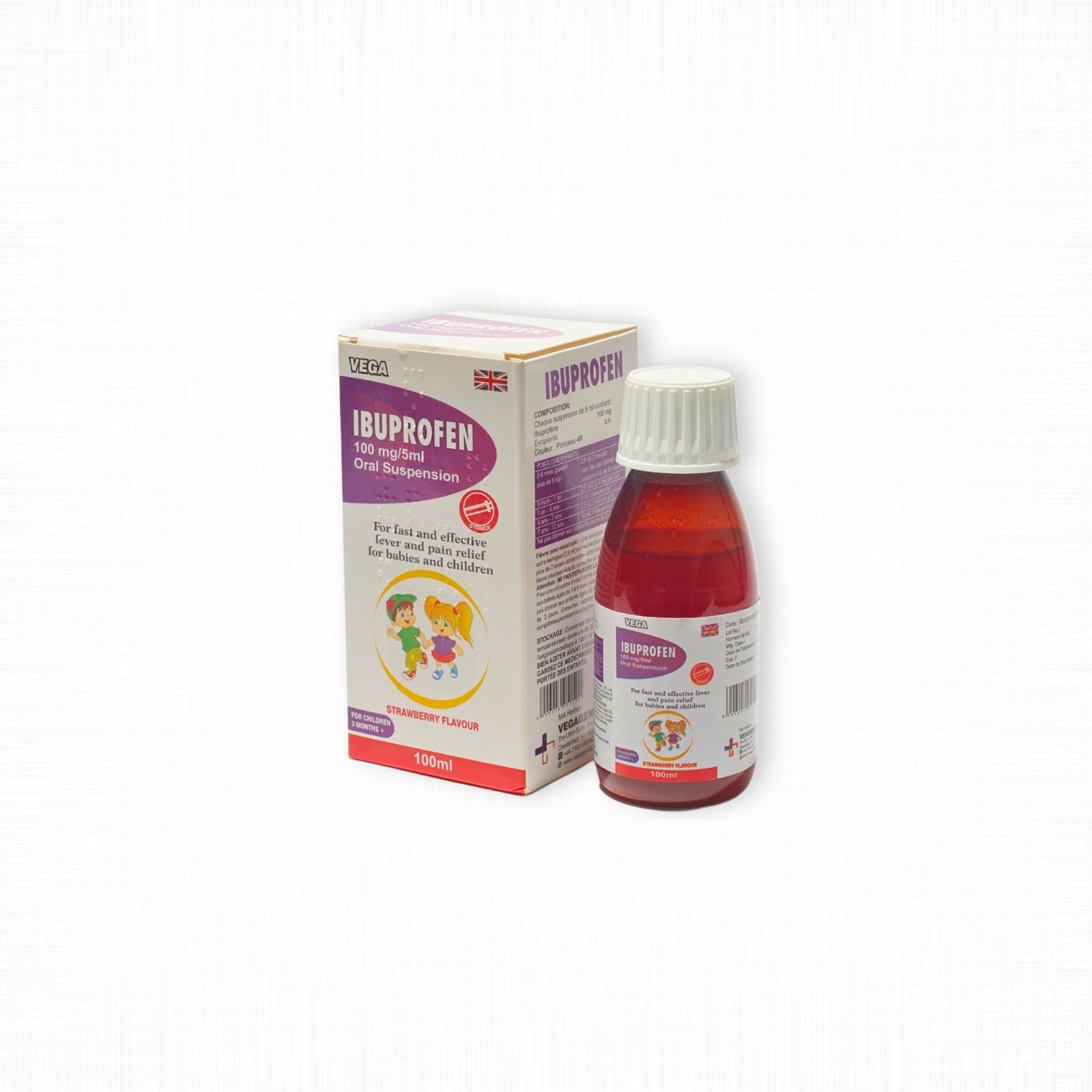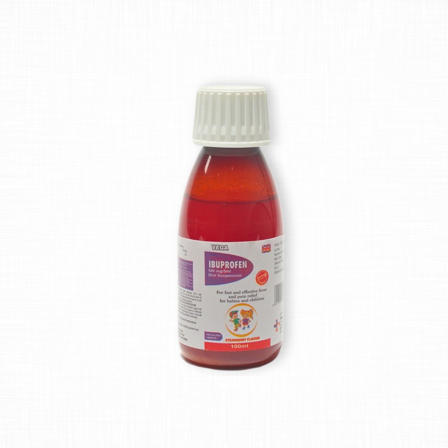 Ibuprofen [Vega] Suspension is a nonsteroidal anti-inflammatory drug (NSAID) formulated as an oral suspension. It is used to relieve mild to moderate pain, reduce inflammation, and lower fever in children.