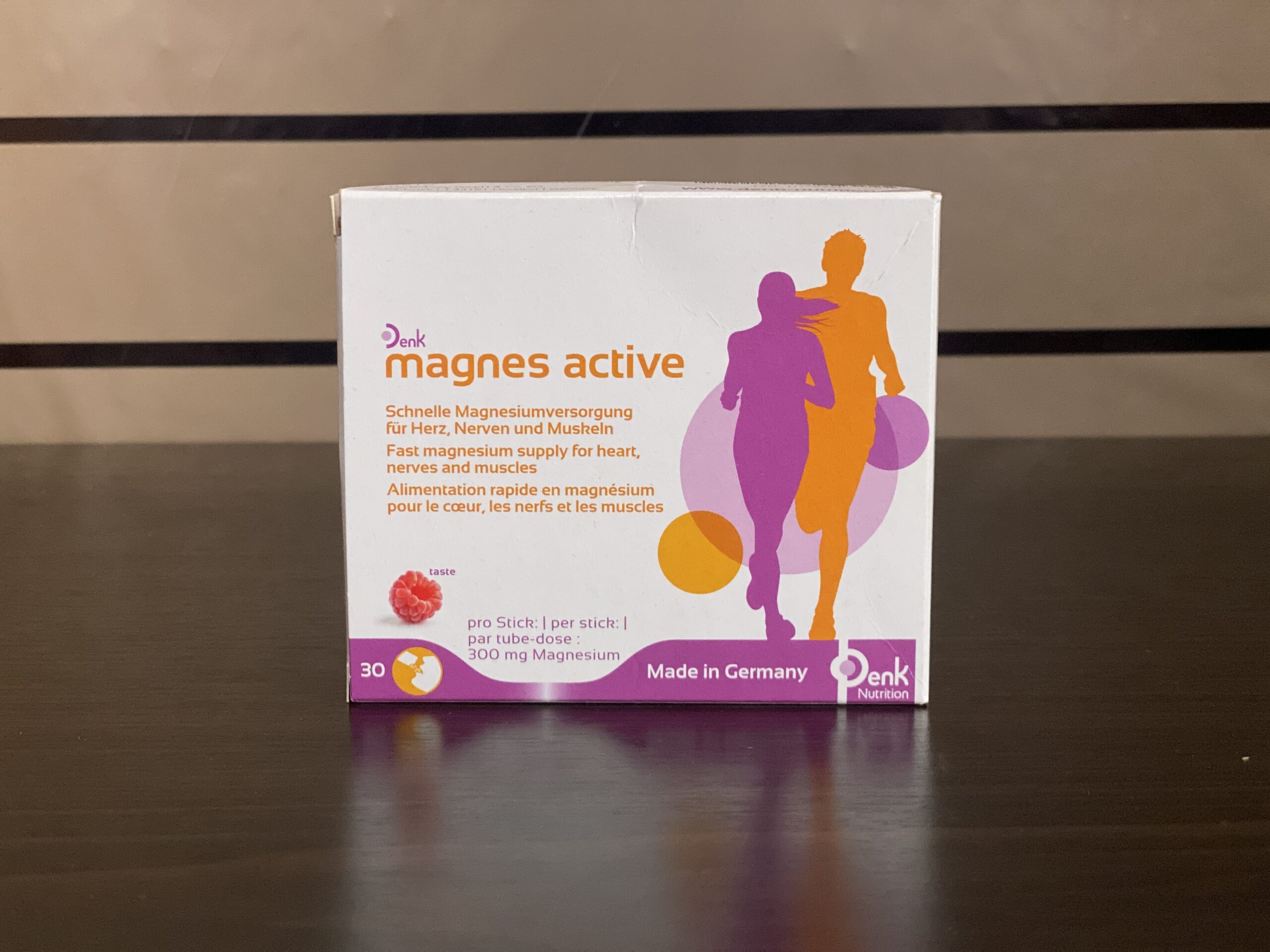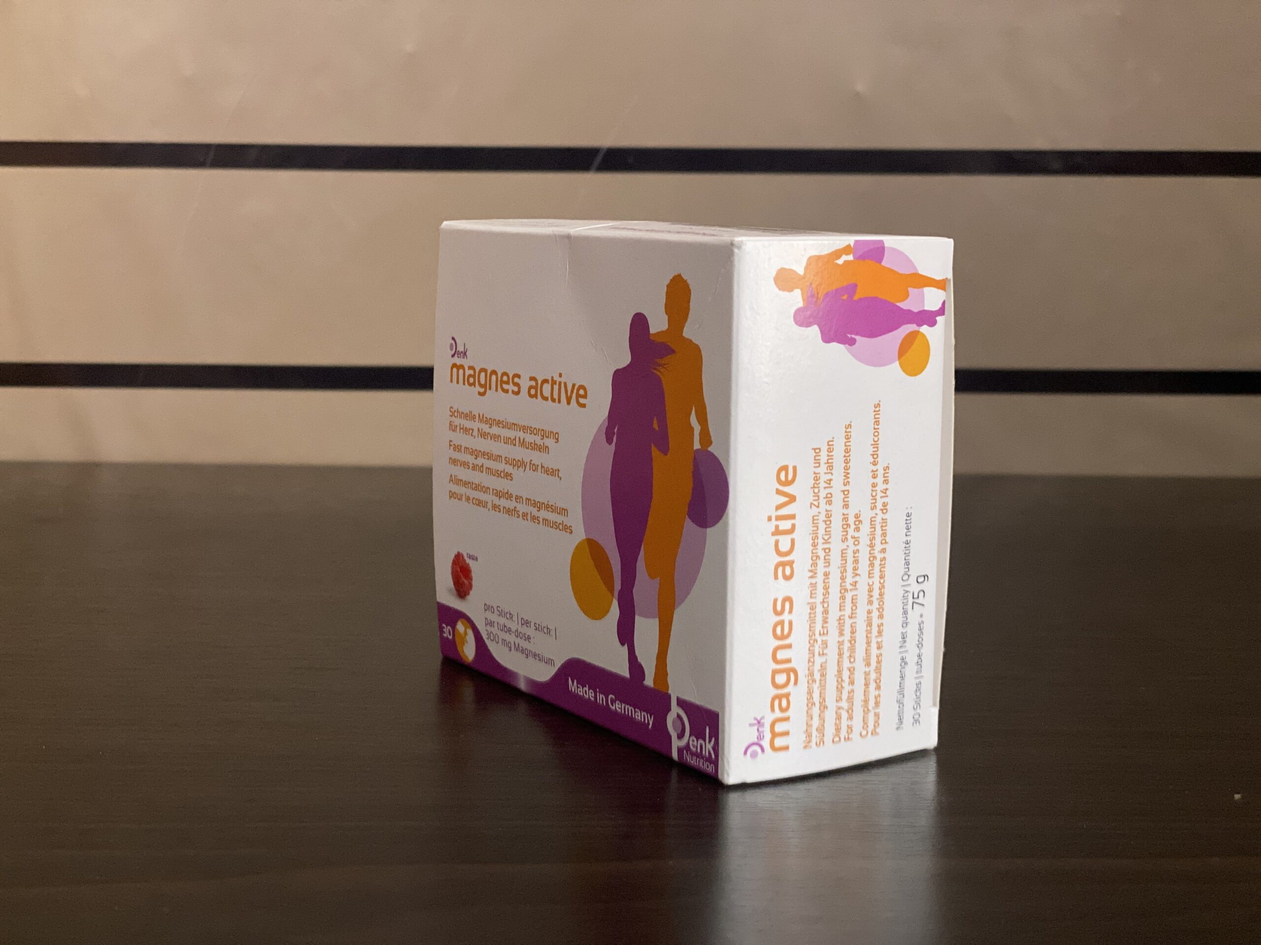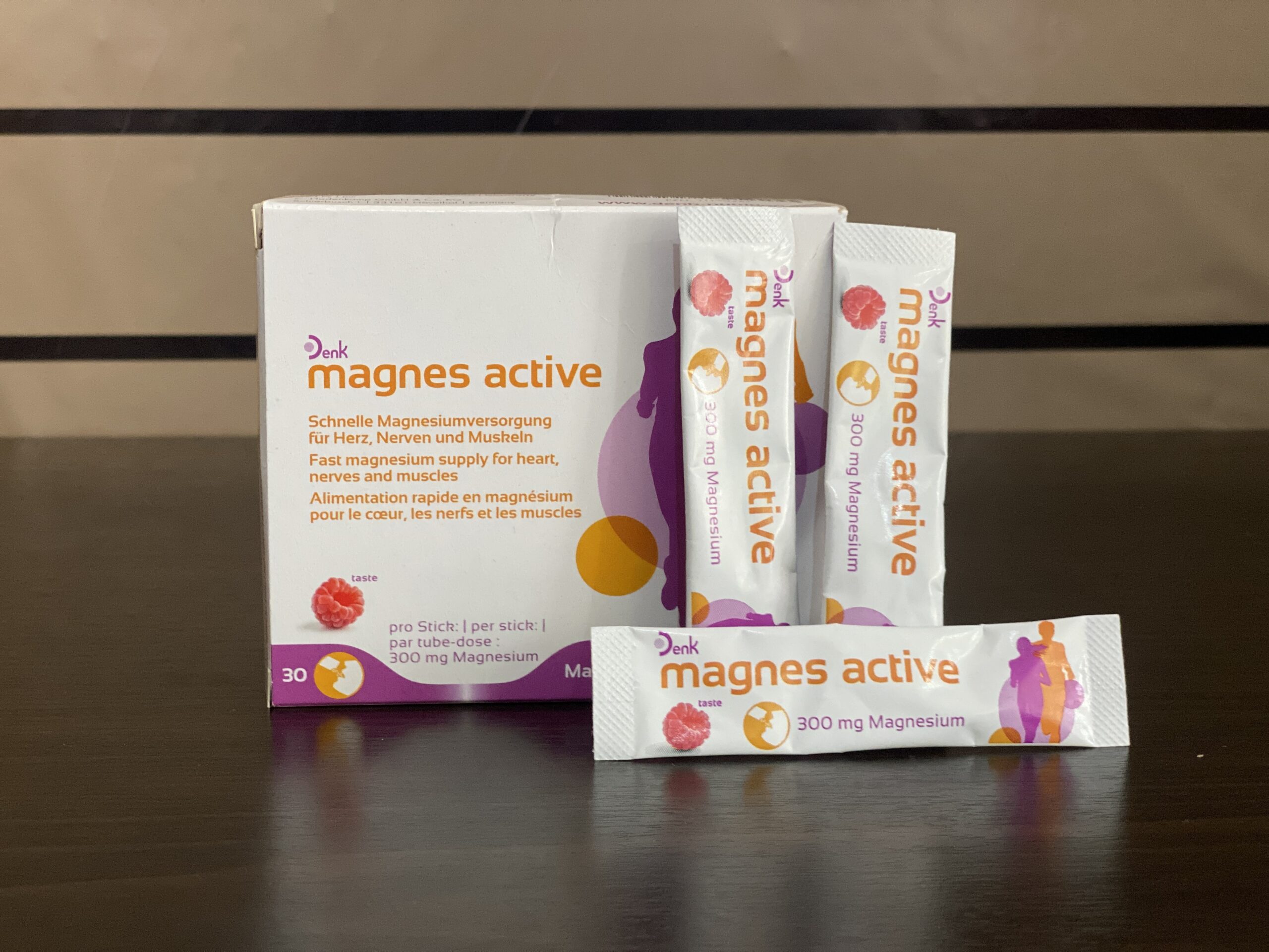 Magnes Active Denk is a dietary supplement providing 300 mg of magnesium per stick. It supports normal muscle, bone, nerve, and heart function, and helps reduce fatigue and exhaustion.