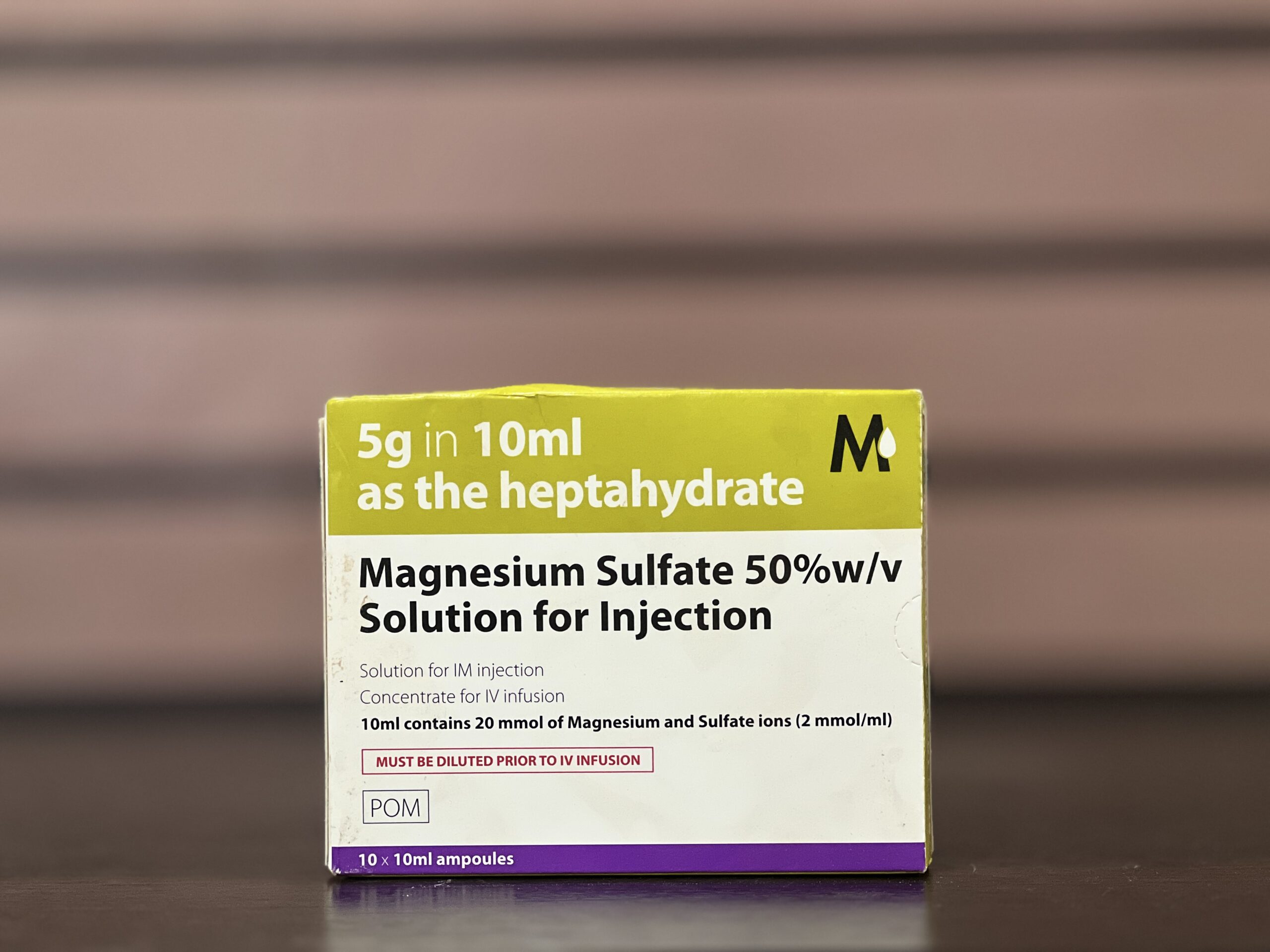 Magnesium Sulfate 50% w/v Solution for Injection (BP) is a concentrated sterile solution of magnesium sulfate heptahydrate used primarily as an anticonvulsant to prevent and control seizures in severe pre-eclampsia and eclampsia (toxemia of pregnancy). It is also used to treat hypomagnesemia (low blood magnesium levels), especially in acute cases with signs of tetany (muscle spasms), and as a tocolytic (to delay preterm labor) in some protocols. The 50% w/v concentration provides 500 mg/ml (approximately 2 mmol/ml Mg²⁺). In Ghana (Accra), it is a standard emergency and obstetric medication stocked in hospitals, maternity wards, and pharmacies for eclampsia management and magnesium replacement.