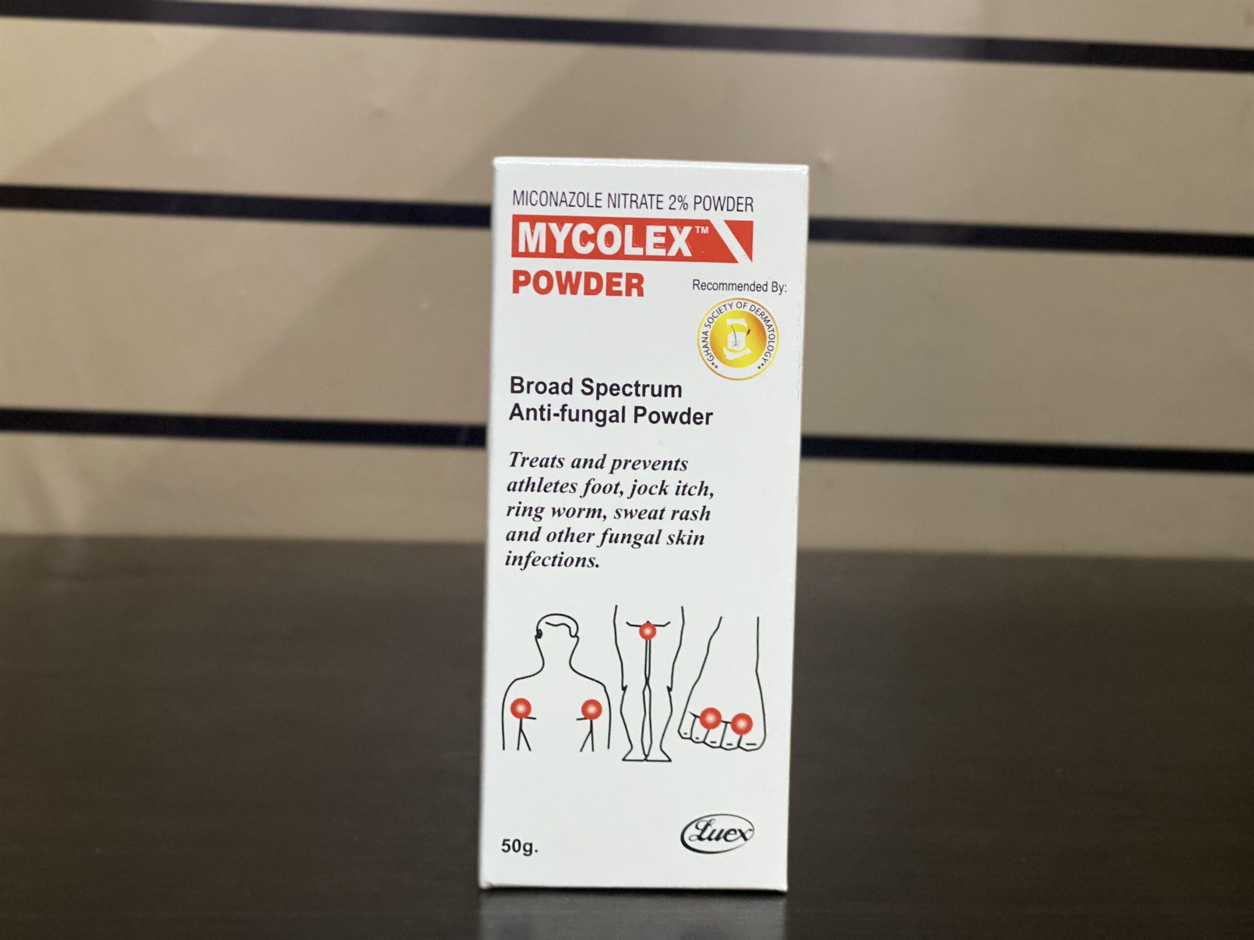 Mycolex Powder is designed to address fungal infections such as athlete’s foot, jock itch, ringworm, sweat rash, and other related skin conditions.