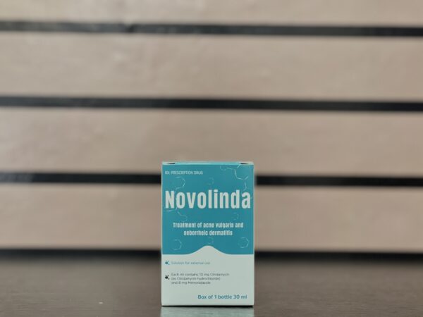 Novolinda solution 30ml is a topical external solution (lotion) used for the treatment of acne vulgaris (especially pustular and cystic acne), acne rosacea, folliculitis, and other skin conditions associated with increased sebum secretion or bacterial involvement. It combines an antibiotic (clindamycin) with an antiprotozoal/antibacterial agent (metronidazole) to reduce inflammation, kill acne-causing bacteria (e.g., Propionibacterium acnes), and control secondary infections or inflammation in acne-prone skin.
