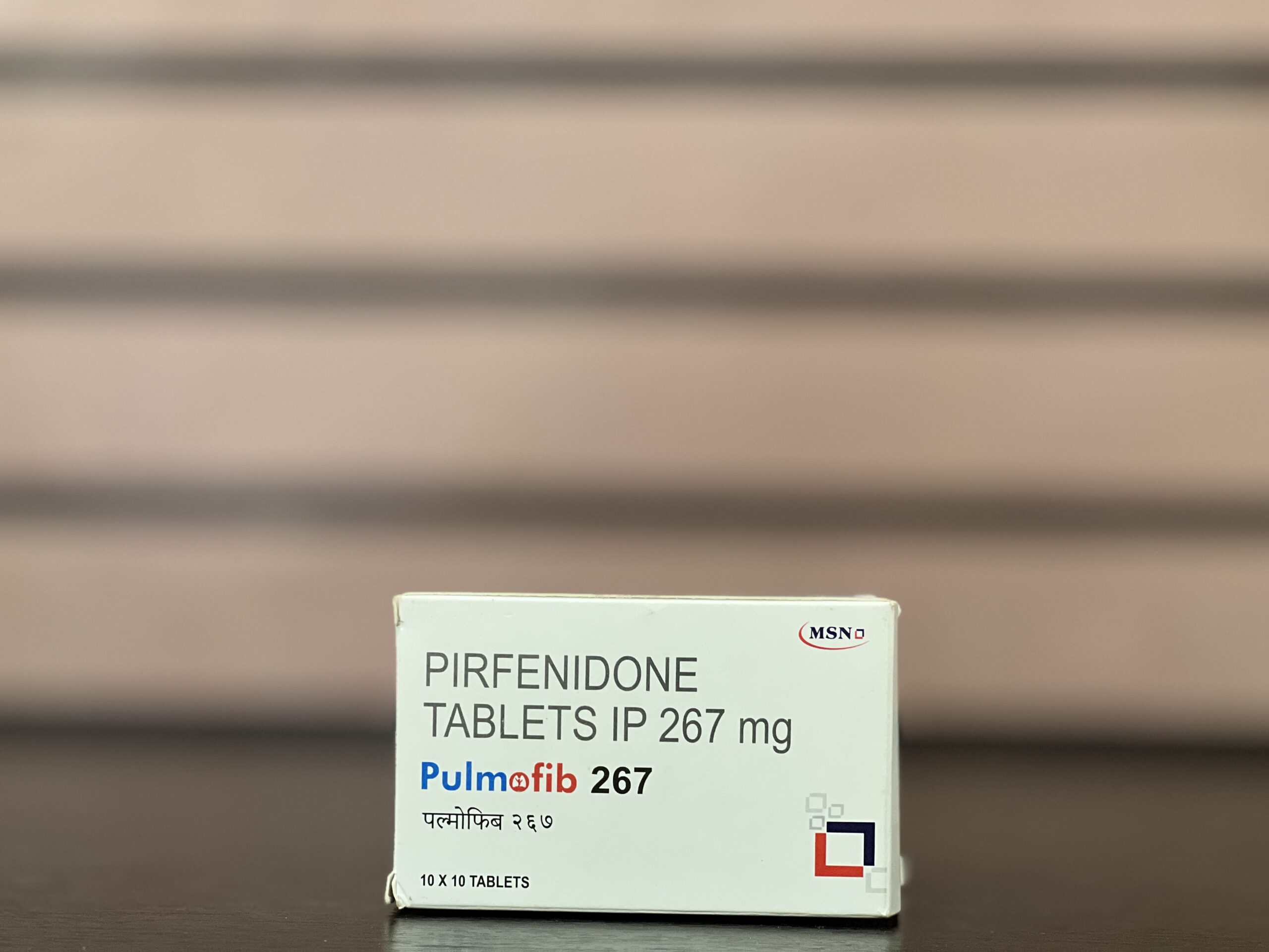 Pirfenidone tablet IP 267mg is a film-coated oral tablet containing the active ingredient pirfenidone. It is an antifibrotic medication used to treat idiopathic pulmonary fibrosis (IPF), a chronic lung disease that causes scarring (fibrosis) in the lungs, making breathing difficult. This generic version (often marketed as Pulmofib or similar by MSN Laboratories) helps slow the progression of lung scarring and decline in lung function.