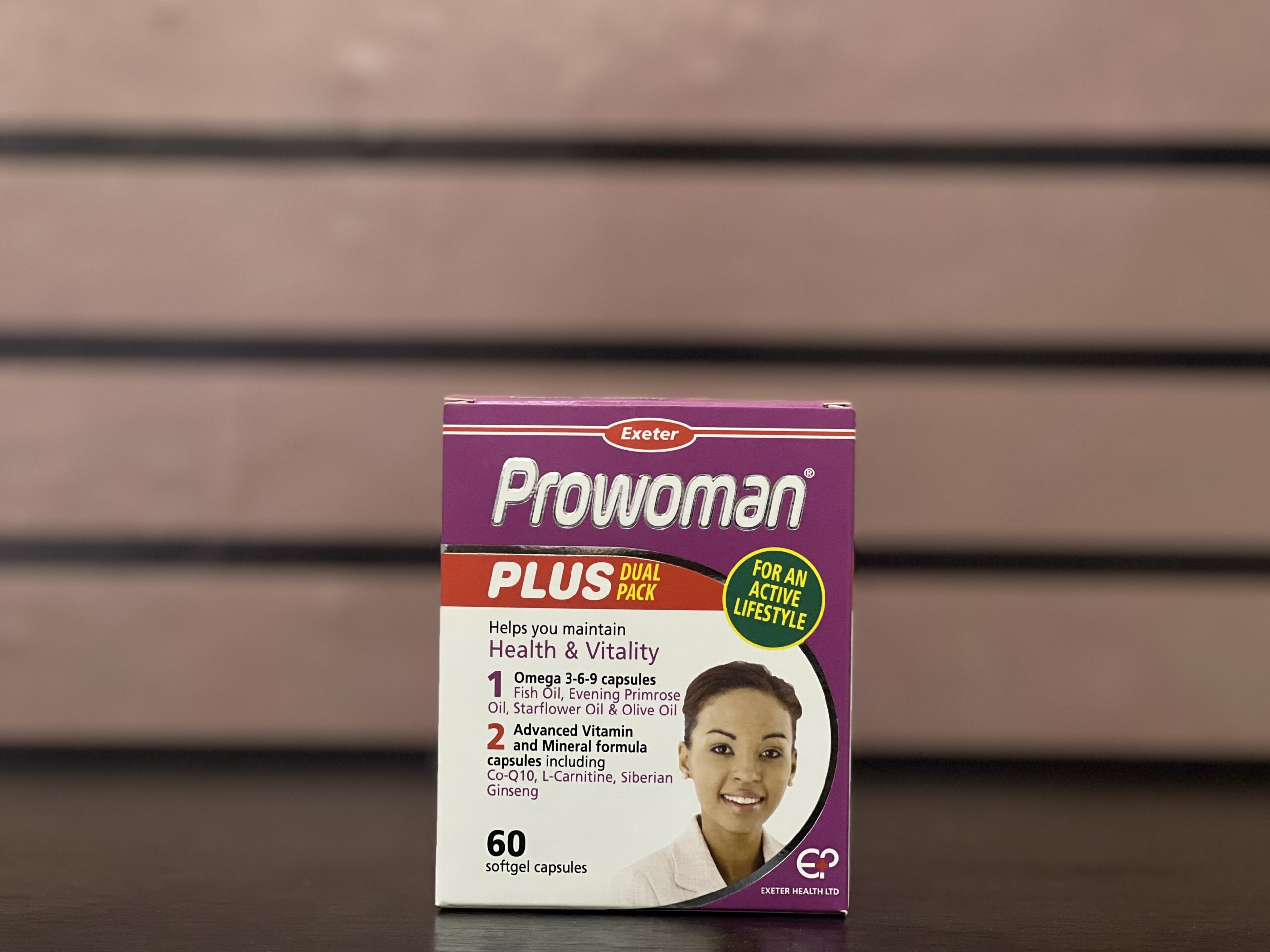 Prowoman Plus 60 Softgel Capsules (by Exeter Pharmaceuticals) is a comprehensive women’s multivitamin and multimineral supplement with added Omega-3-6-9 fatty acids. It is designed to support women’s health and vitality, providing essential nutrients for energy, immune function, hormonal balance, skin/hair/nail health, bone support, and overall wellbeing. The formula includes evening primrose oil and starflower oil (sources of GLA) to help with hormonal balance (e.g., PMS, menopause symptoms), along with a broad range of vitamins, minerals, and trace elements. It is marketed as a once-daily nutritional support for women, gentle on the stomach and easy to swallow due to softgel form. In Ghana (Accra), it is a popular OTC supplement available in pharmacies (e.g., Beybee Pharmacy, Scab Pharmacy) for women’s general health, fertility support, and menopausal transition.