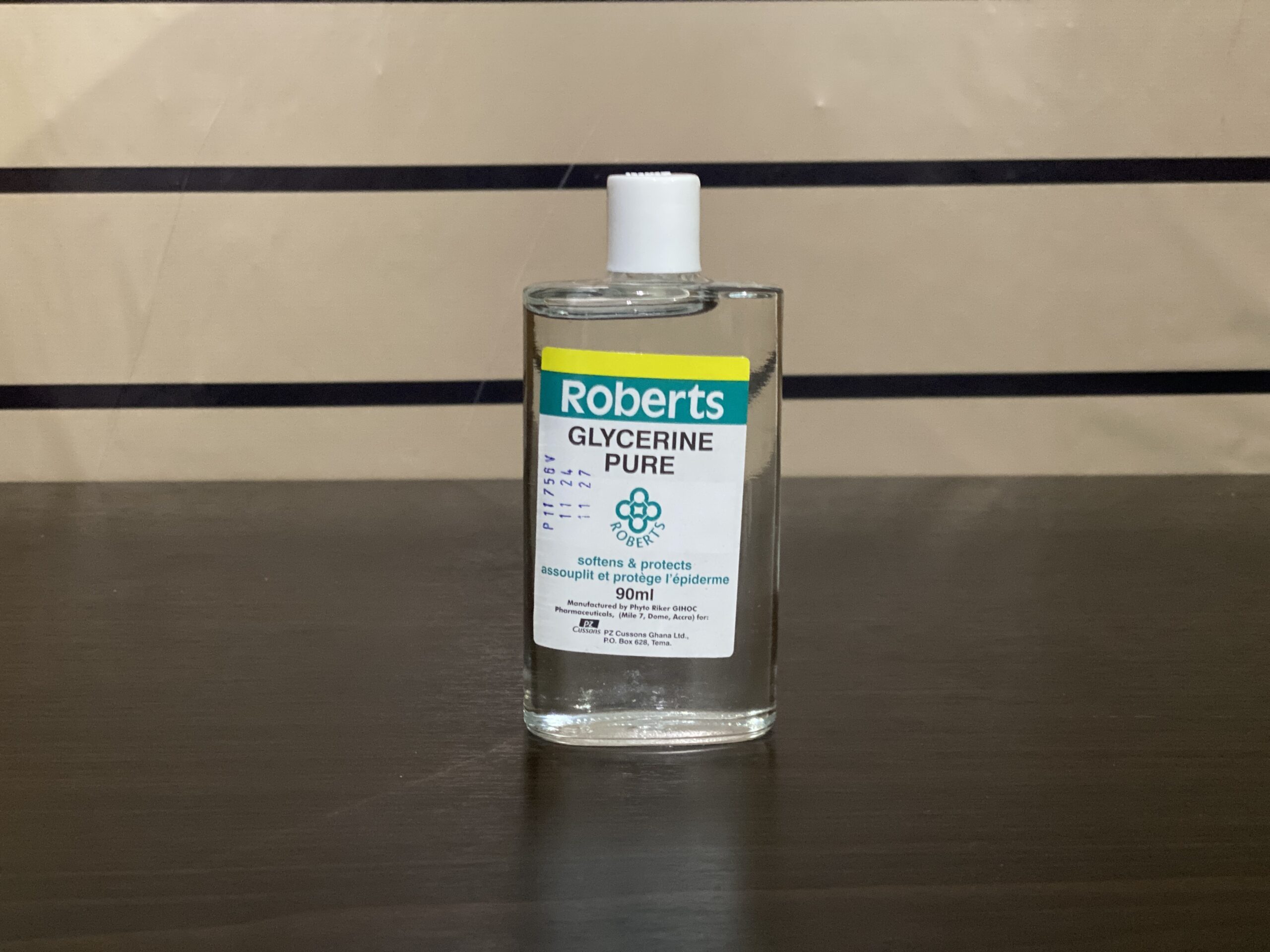 Robert’s Glycerine 90ml is a viscous, colorless liquid primarily composed of glycerol (also known as glycerine). It’s a naturally occurring sugar alcohol derived from plant and animal sources like vegetables and fats. This specific product comes in a 90ml bottle.