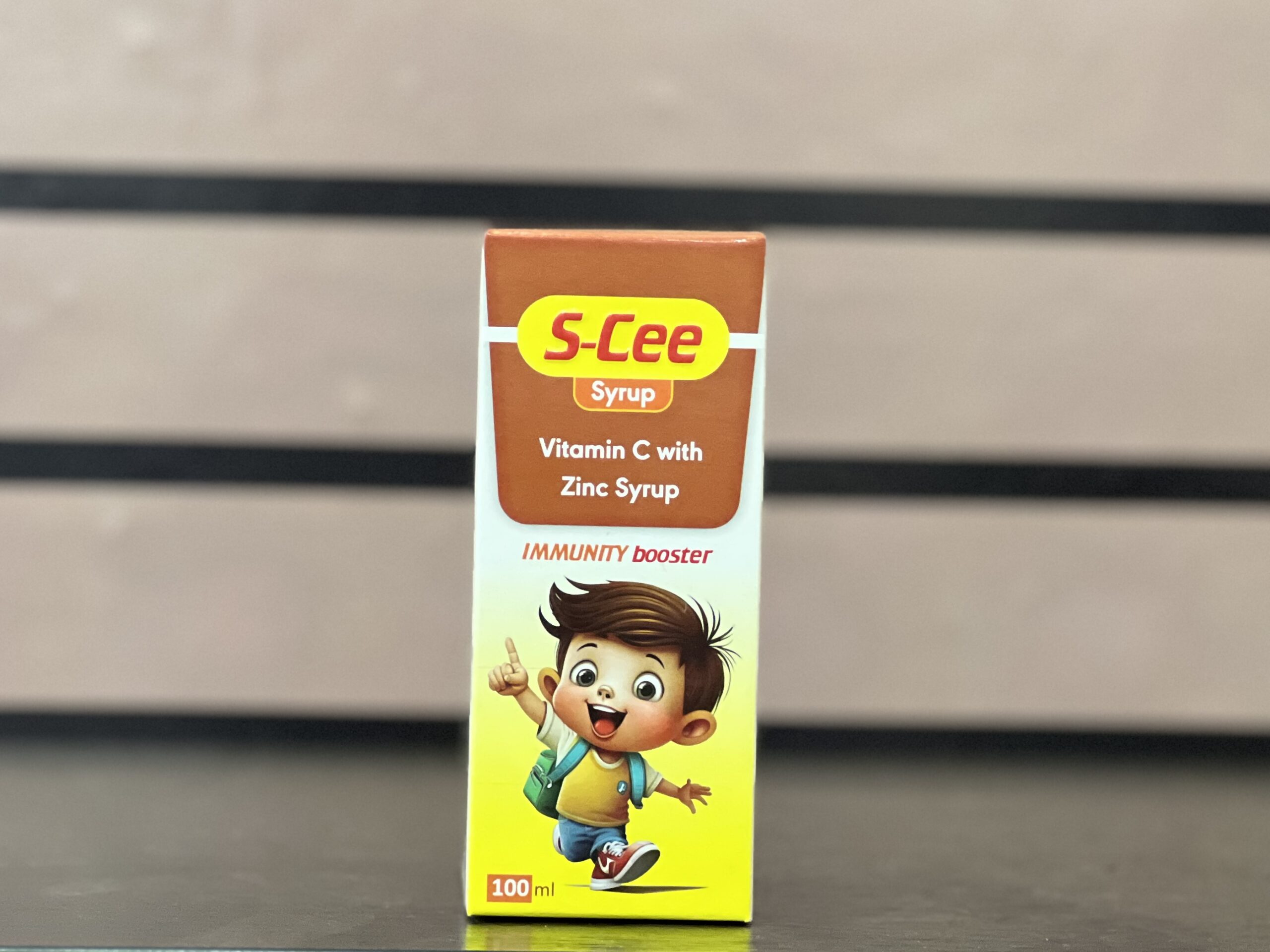 S-Cee Syrup 100ml is a liquid dietary supplement providing Vitamin C (ascorbic acid). It serves as an immunity booster, supports collagen formation, promotes wound healing, acts as an antioxidant to protect cells from oxidative stress, enhances iron absorption, and helps prevent or treat Vitamin C deficiency (scurvy). It is commonly used for general immune support, recovery from illness, skin health, or dietary supplementation in children and adults, especially during cold/flu season or poor diet.