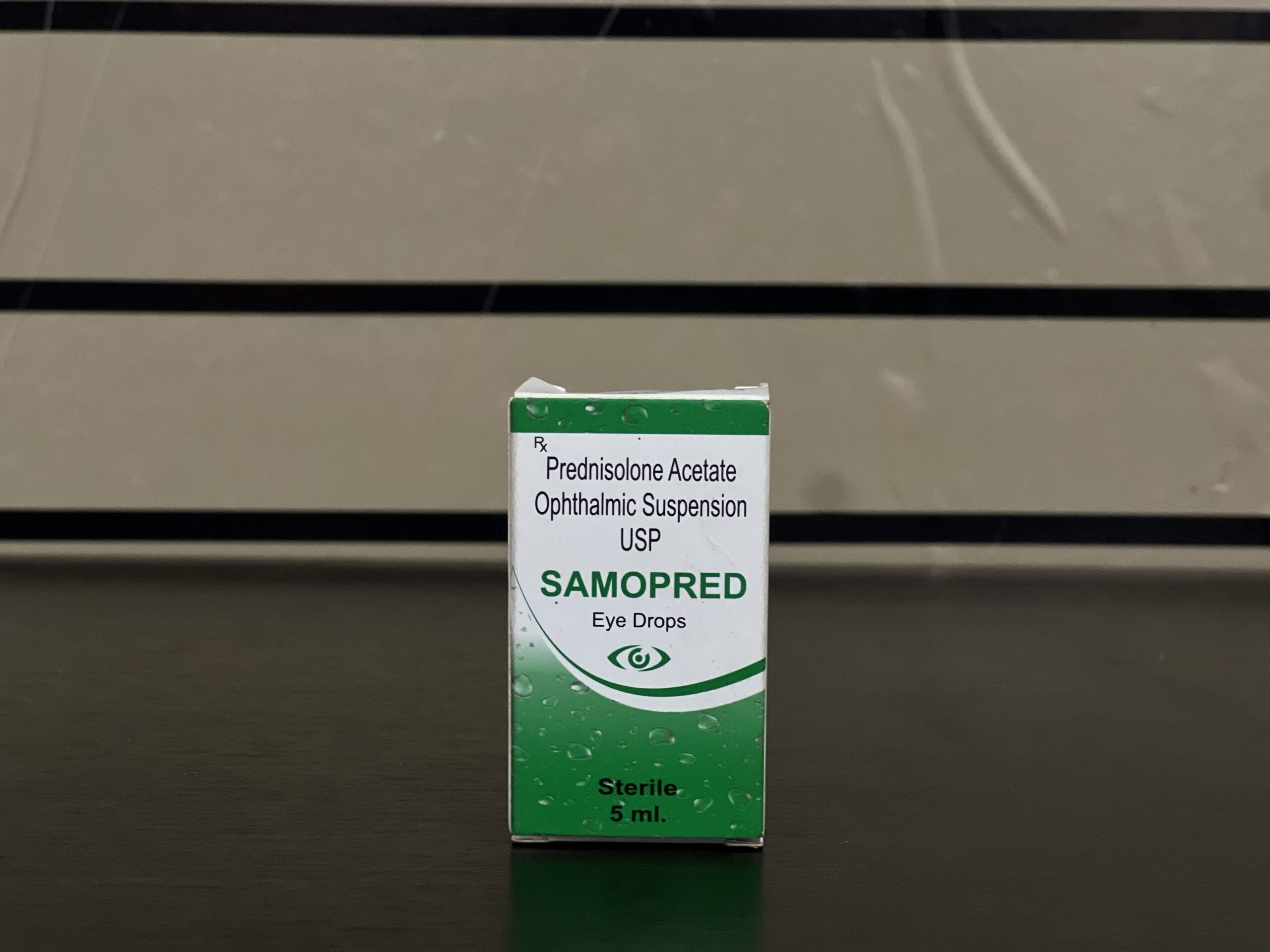 Samopred eye drops contain prednisolone, a corticosteroid medication, used to treat inflammation in the eye. It comes in various strengths, typically ranging from 0.1% to 1%, depending on the severity of the inflammation.