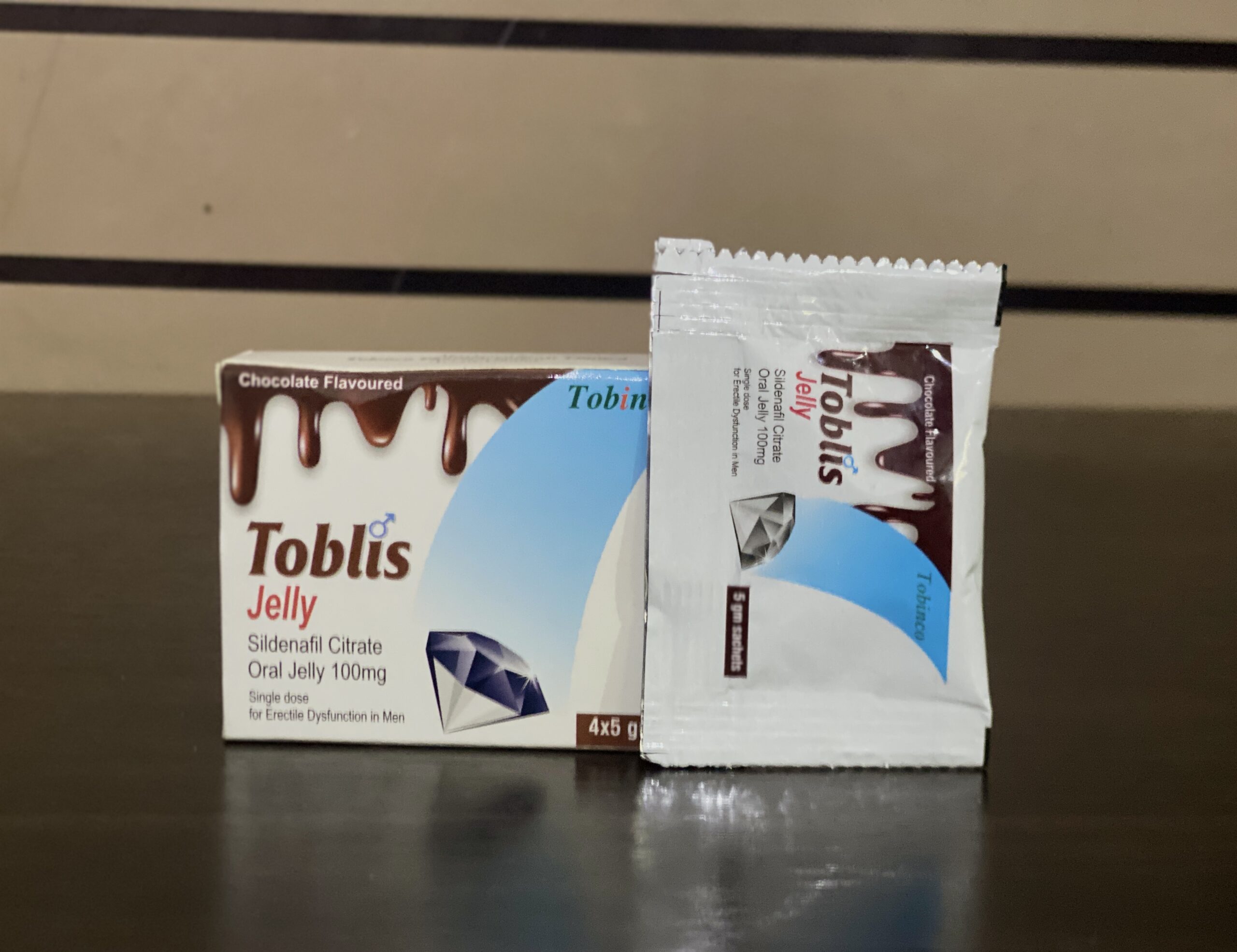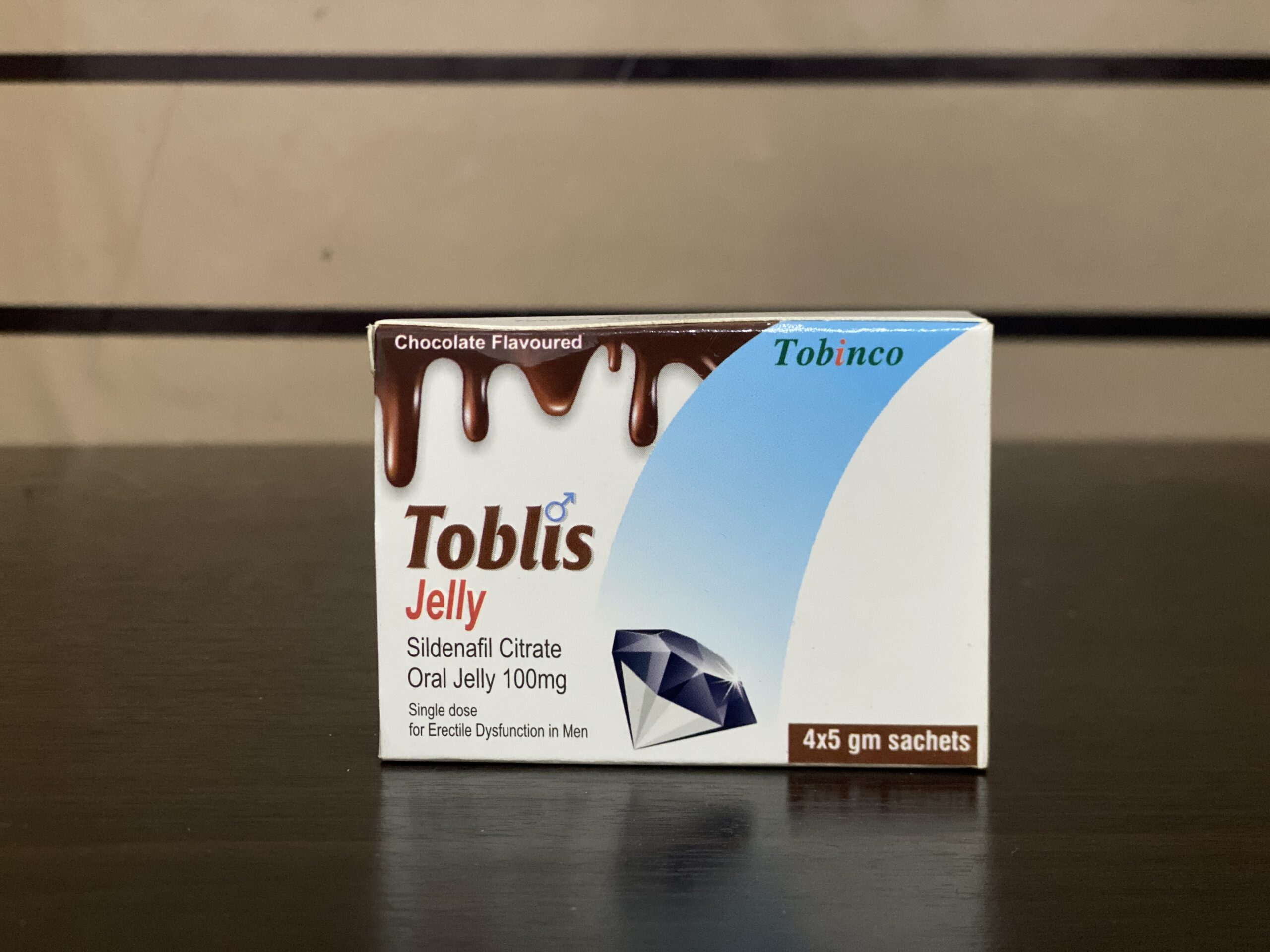 Toblis Jelly Oral 100 mg is a flavored oral jelly formulation of sildenafil citrate, used to treat erectile dysfunction by helping men achieve and maintain an erection sufficient for satisfactory sexual performance. The jelly form allows faster absorption compared to tablets and is an alternative for men who have difficulty swallowing pills.