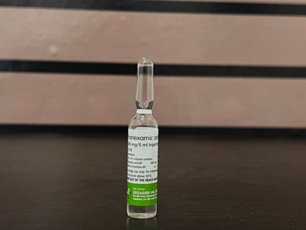 Each 5 ml ampoule contains: Tranexamic acid BP 500 mg (100 mg/ml). Excipients: Water for injections (sterile, non-pyrogenic); no preservatives in most formulations.