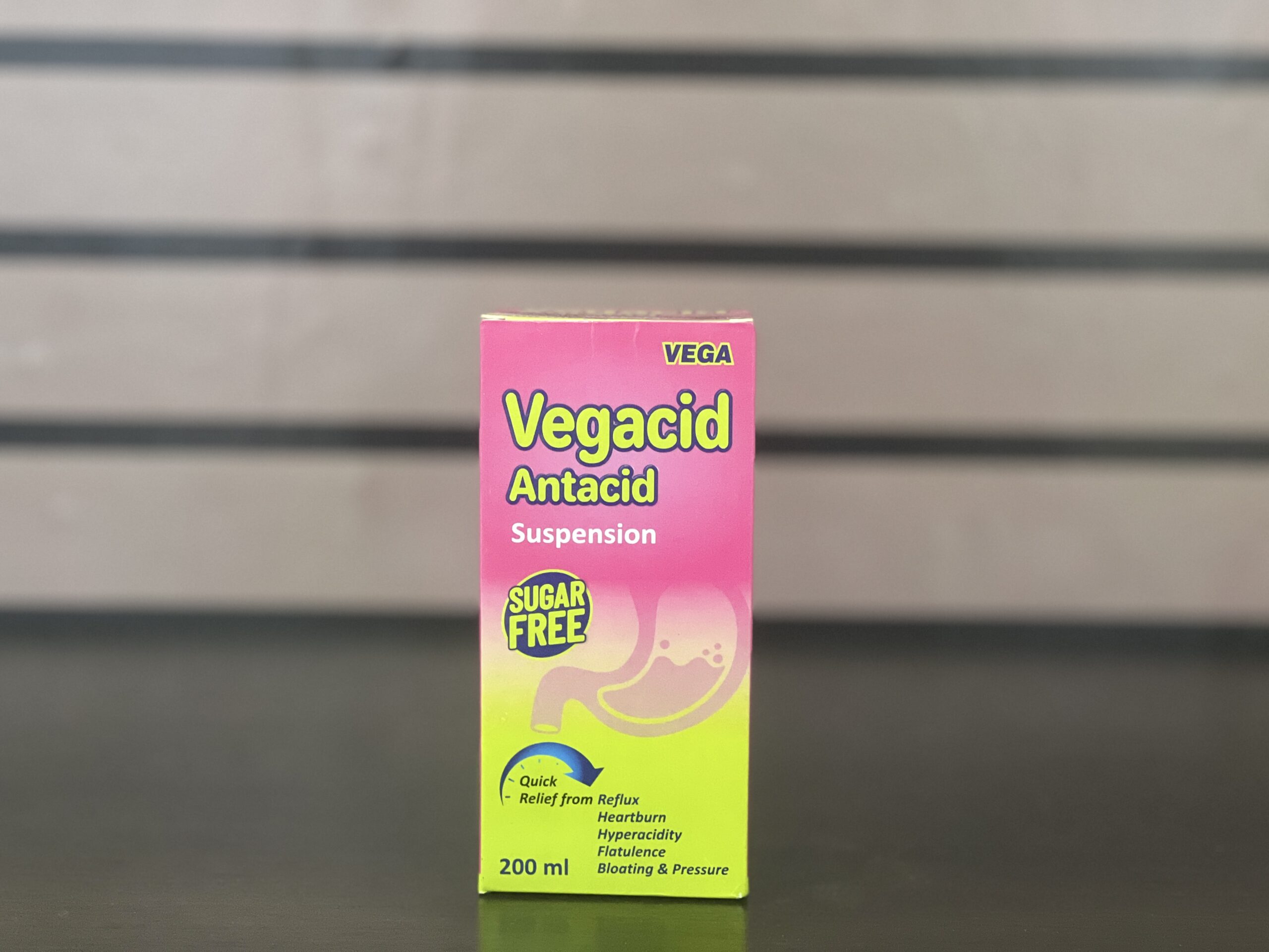 Vegacid Suspension is a combination medicine used to treat conditions such as acidity, stomach ulcers, bloating, indigestion, heartburn, and gas. It works by neutralizing excessive stomach acid and facilitating the easy passage of gas.​