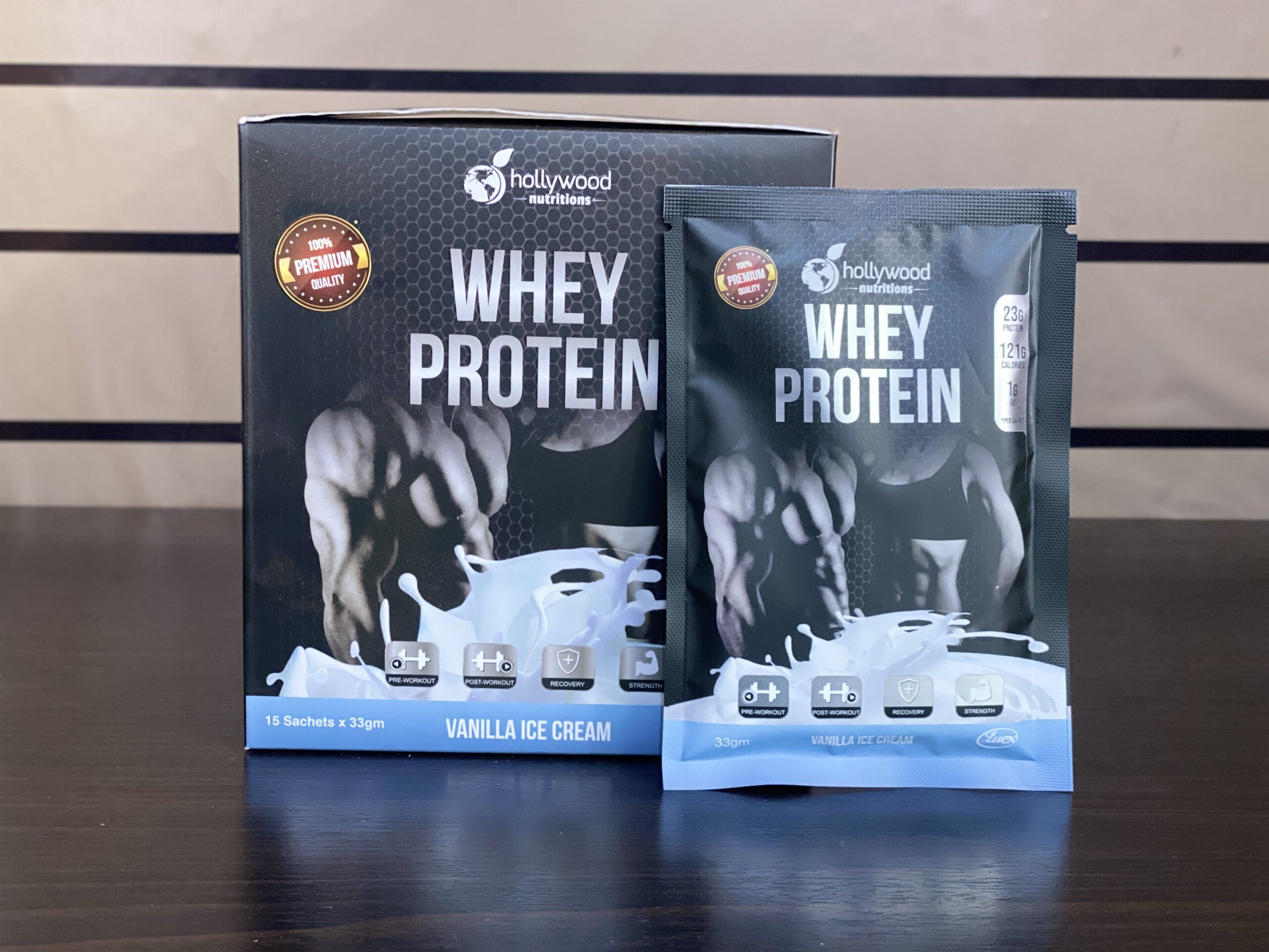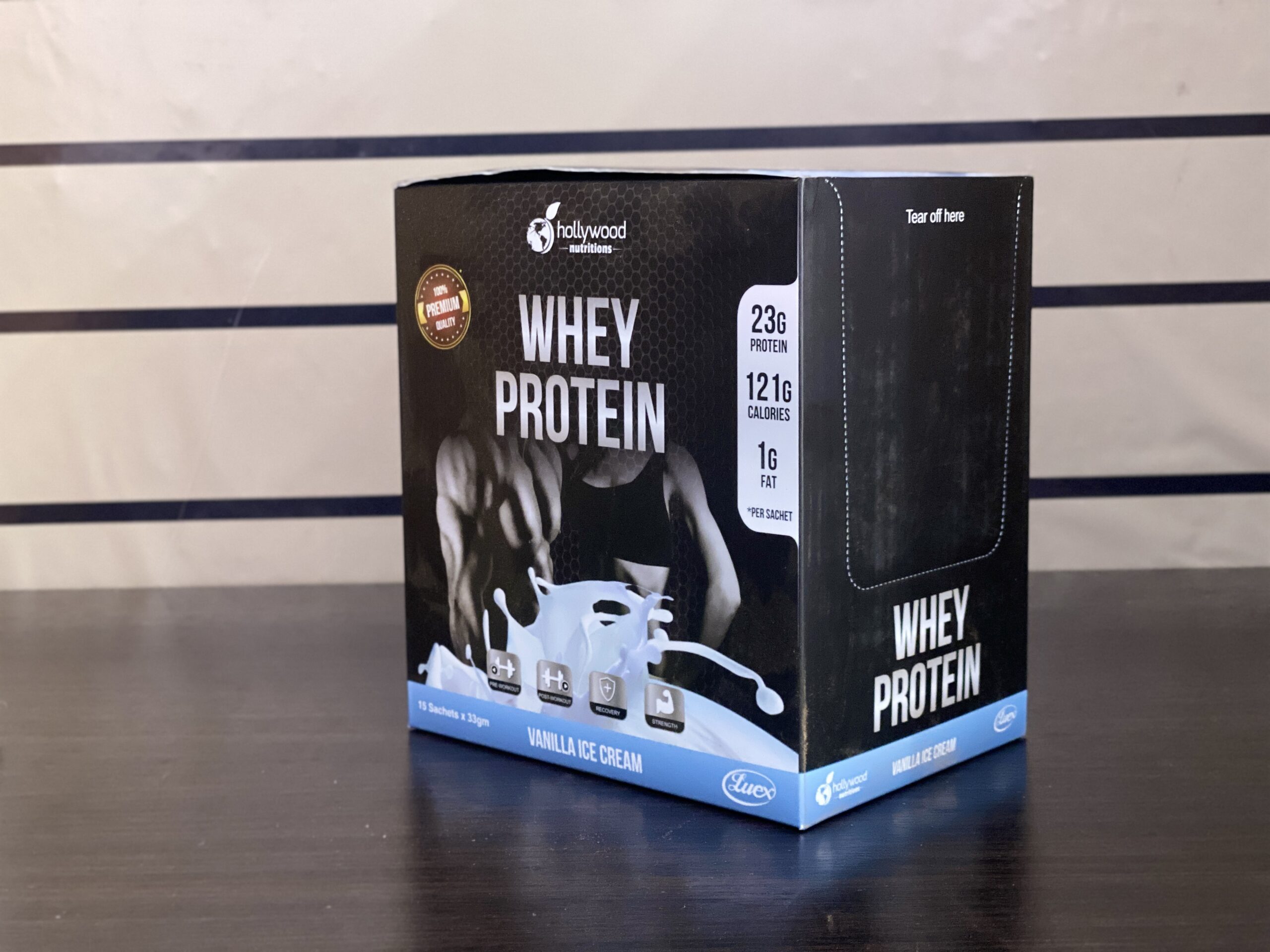 • Various brands manufacture whey protein sachets. For example, Diamondcut offers a Vanilla Ice Cream Whey Protein Single Serve Sachet.
